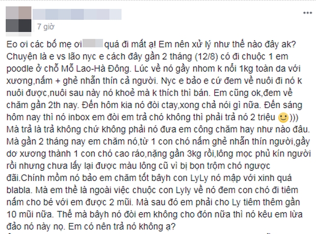 “Chuyện là em với người yêu cũ cách đây gần 2 tháng (12/8) có đi chuộc 1 em Poodle ở chỗ Mỗ Lao - Hà Đông. Lúc về nó gầy nhom không nổi 1kg toàn da với xương, nấm + ghẻ nhẵn thín cả người. Người yêu cũ em bảo em cứ đem về nuôi đi anh ấy không nuôi được, nuôi sau này nó khoẻ mà không thích thì bán. Em cũng đồng ý, đem về chăm gần 2 tháng nay.