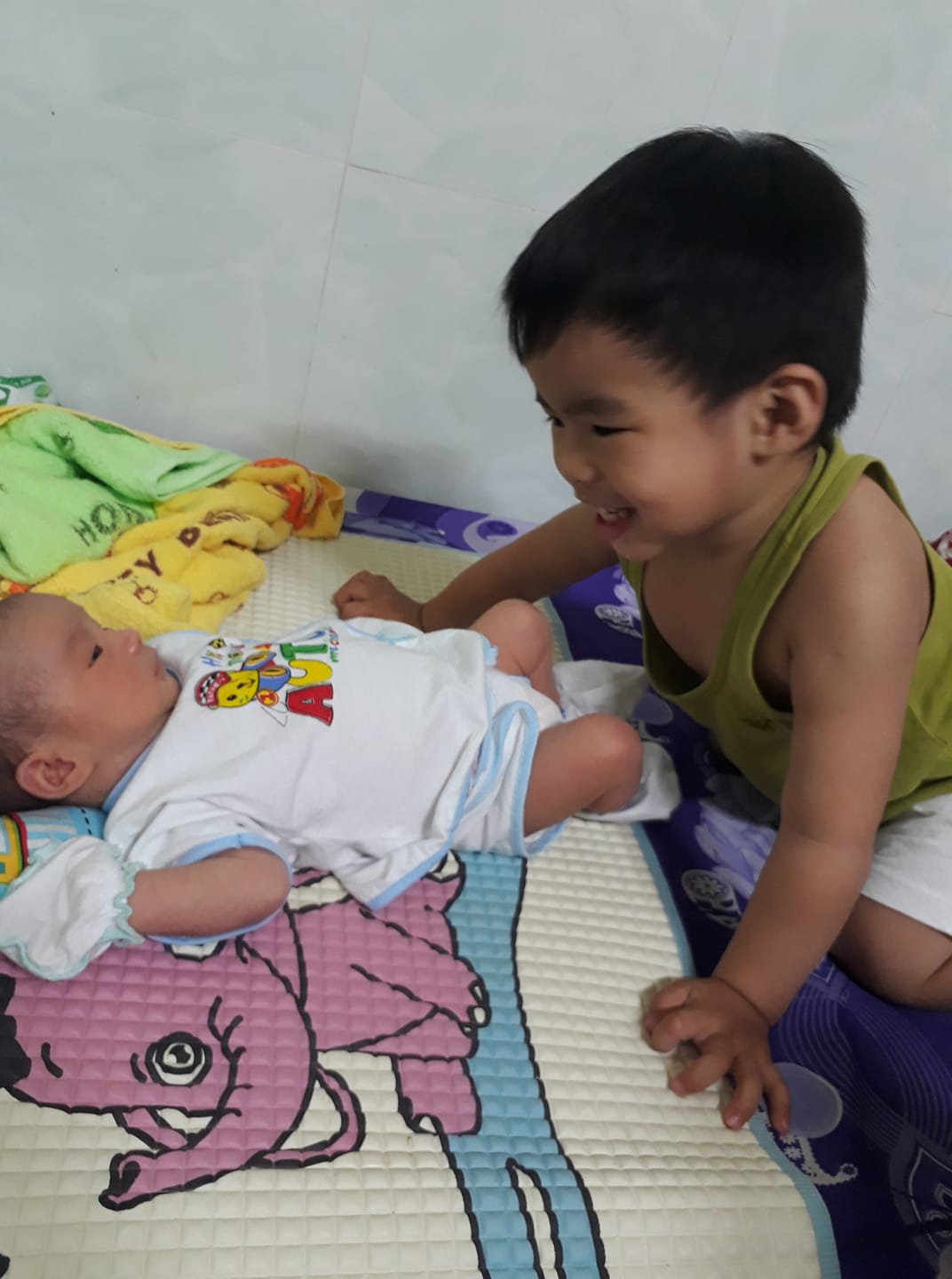 Chị gần 3 tuổi, thằng em 1 tháng rưỡi. Vui thì nựng má em, buồn thì vỗ đôm đốp vào má, facebook C. chia sẻ