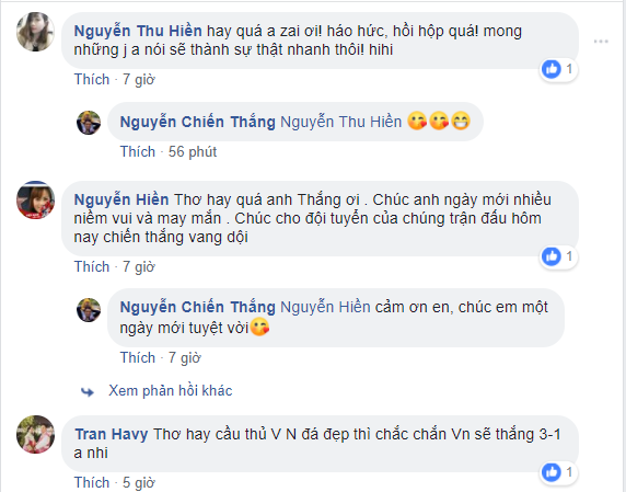 Nghệ sĩ luôn là người truyền được nguồn cảm hứng vô cùng mạnh tới khán giả. Đây không phải lần đầu tiên Chiến Thắng viết ra những dòng thơ gửi tặng ĐT Việt Nam. Nhiều khán giả thậm chí còn gợi ý nam danh hài sáng tạo một tiểu phẩm ngắn về tinh thần bóng đá của nước nhà.