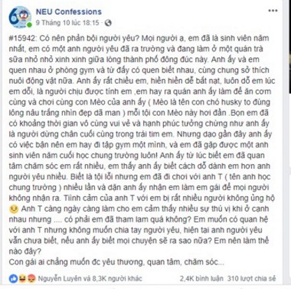 Câu chuyện của cô gái dưới đây đăng tải trên trang NEU Confessions nổi tiếng của Đại học Kinh tế Quốc dân đã gây ra rất nhiều tranh cãi. Nhưng phần lớn ý kiến đều cho rằng “Ngoại tình vốn đã là một hành động sai trái”. Việc cô gái kể lể về cái sự ngoại tình của mình trên mạng xã hội cũng chính là một hành động sai lầm. Vì chắc chắn số người đồng cảm thì ít mà số người ném đá thì nhiều.