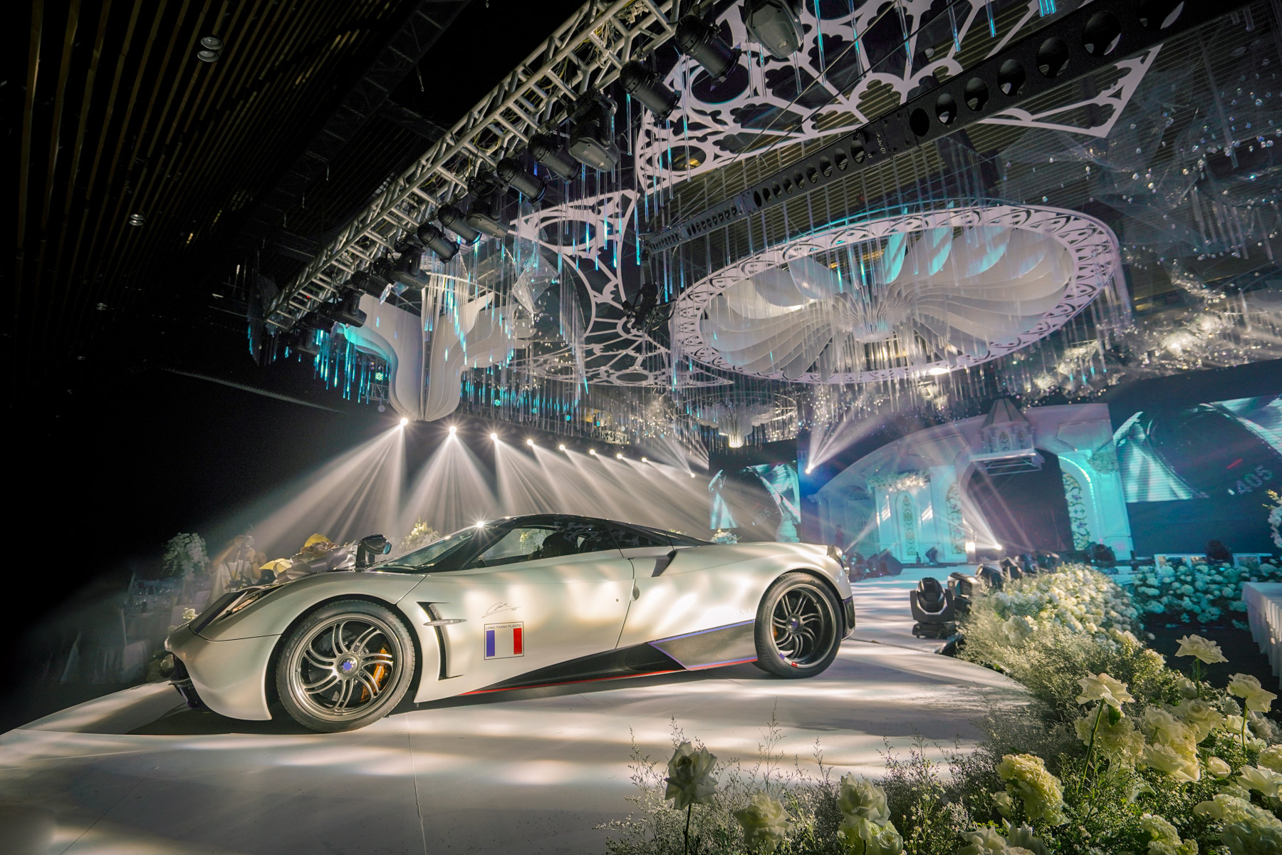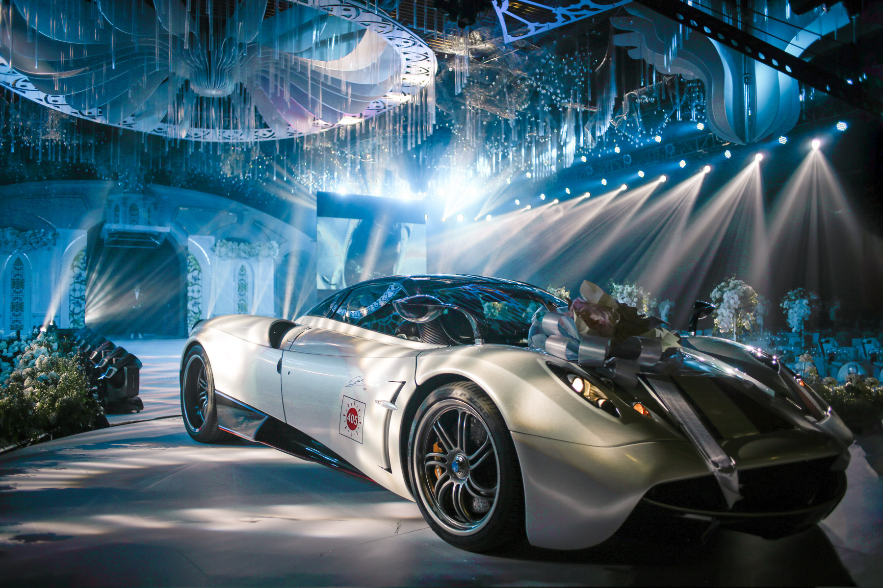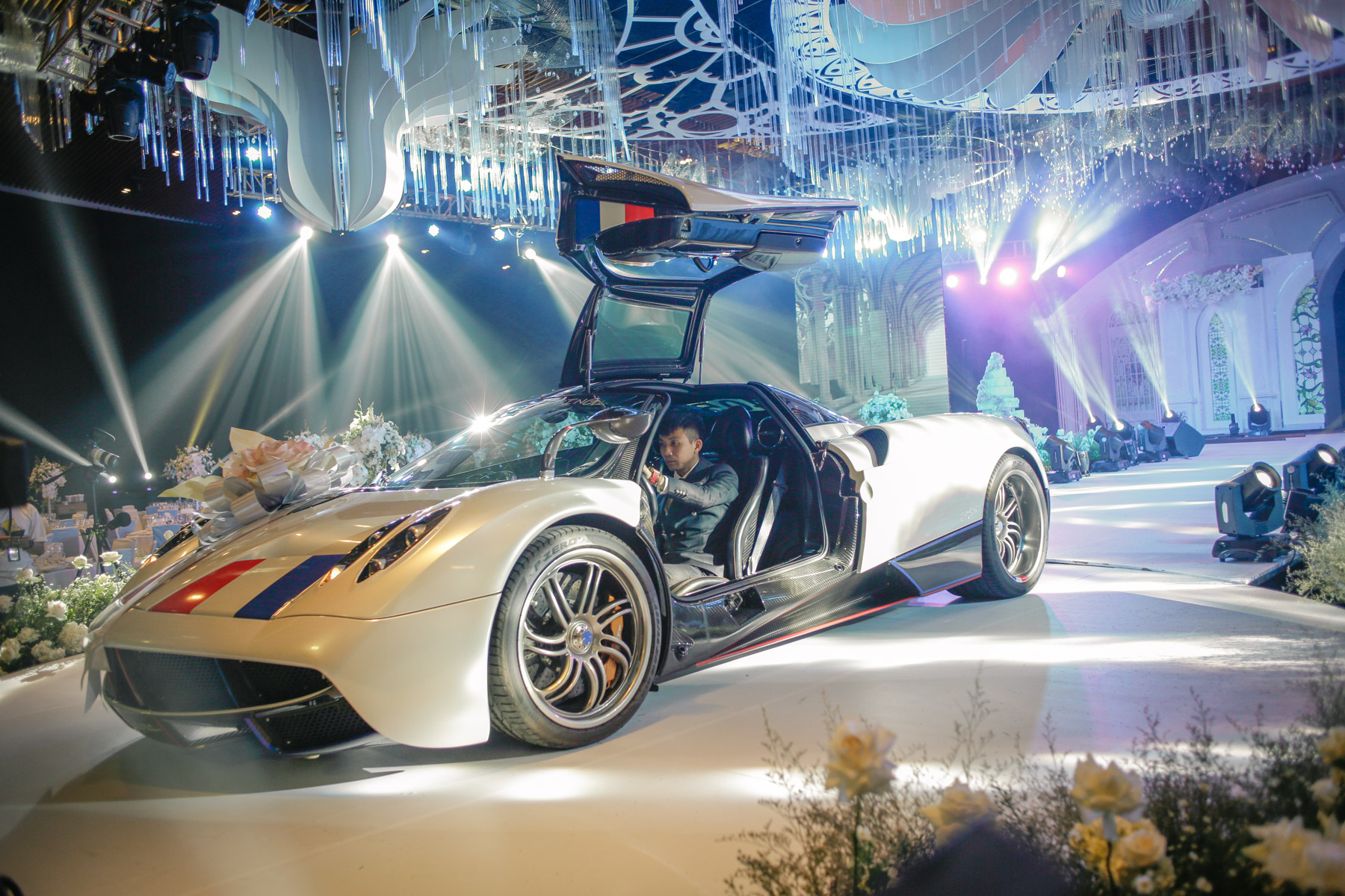 Trong sự kiện trọng đại của con gái đầu lòng, đại gia Minh Nhựa tổ chức hôn lễ hoàn toàn chiều theo ý thích của con, sử dụng rất nhiều siêu xe trong bộ sưu tập của mình cho đám cưới. Tại tiệc cưới vào tối 8/9, cô dâu Minh Anh còn được chính vị đại gia ngành nhựa lái chiếc xe trị giá 80 tỷ Huyra Pagani đưa lên sân khấu khiến quan khách vô cùng ngỡ ngàng.
