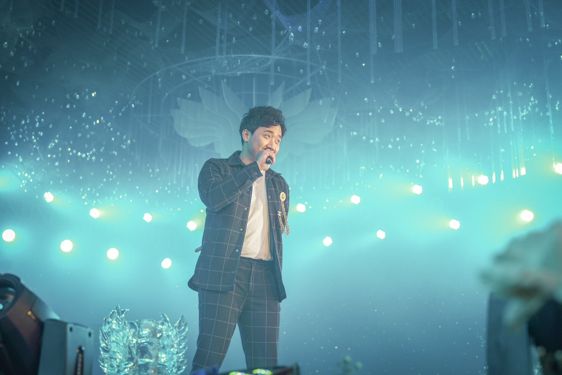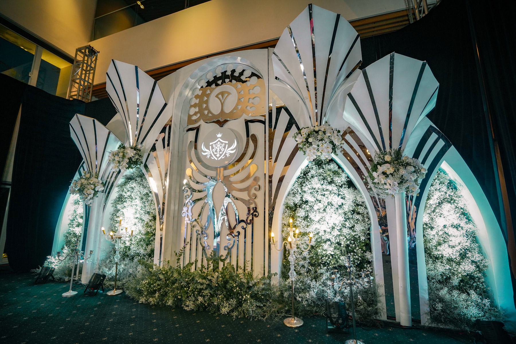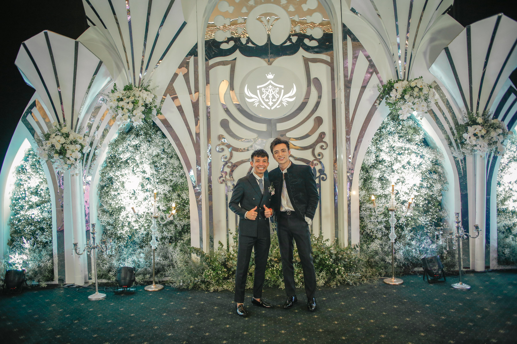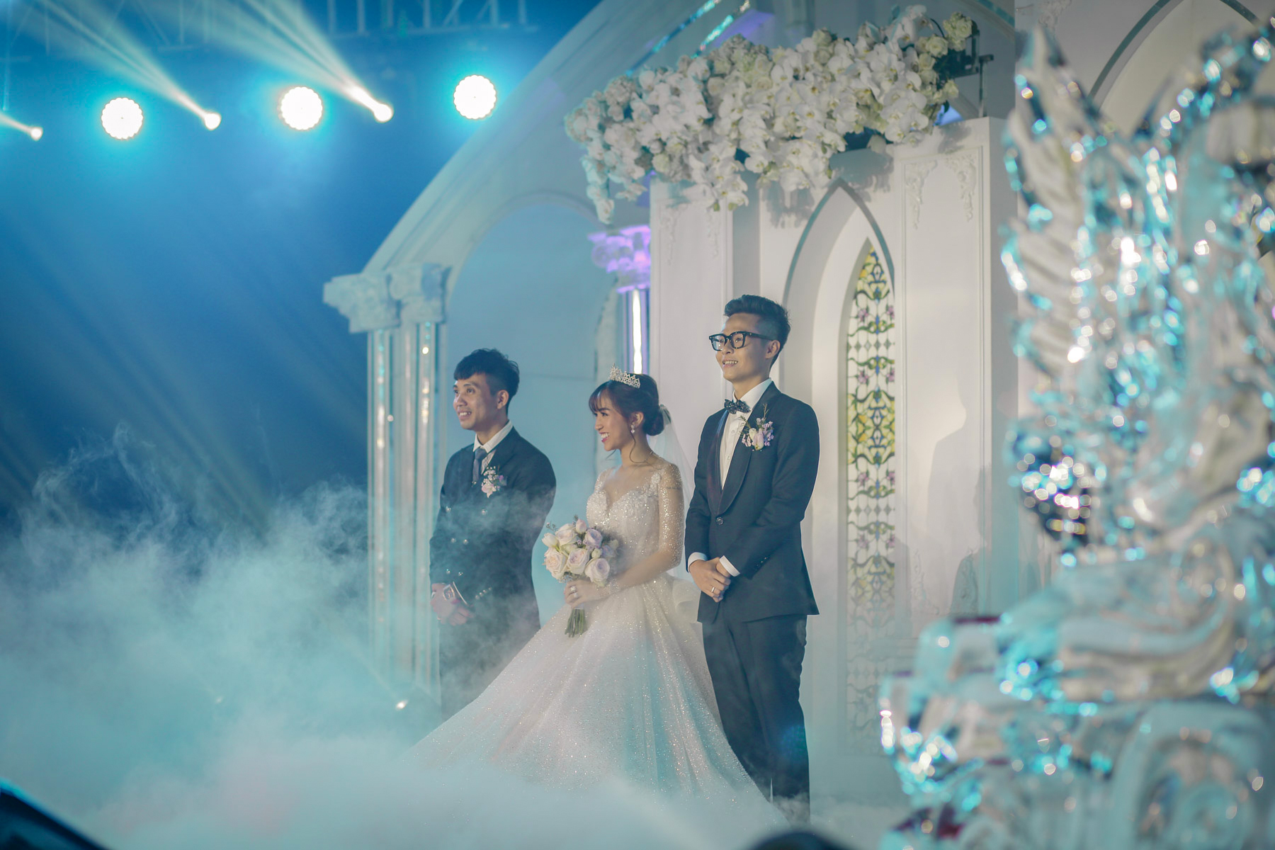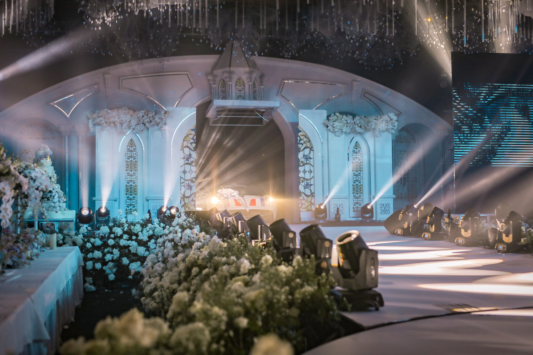 Không gian tiệc cưới thiết kế như một tòa lâu đài tráng lệ trên không trung với hoa hồng trắng, mây bay như “chốn bồng lai tiên cảnh”. Toàn bộ không gian được lấy cảm hứng theo phong cách tân cổ điển và sử dụng những vật liệu trang trí cao cấp nhất.