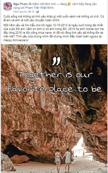 Đáp lại chân tình, Mina Phạm nhắn nhủ đến chồng: “Cuộc sống không có tình yêu khác gì một cuốn sách không có chữ. Có lẽ em và anh là một câu chuyện hoàn chỉnh. Một năm yêu và tìm hiểu cho tới ngày 12/10/2012 là ngày trọng đại nhất của cuộc đời em. Cảm ơn vì có anh trong đời. 2014 hạ sinh Nobita con trai đầu lòng, 2016 ra đời công chúa Nana. Ai đã nói rằng tình yêu sẽ không tồn tại mãi mãi? Tình yêu của chúng mình đã chứng minh điều hoàn toàn ngược lại. Happy Anniversary”.