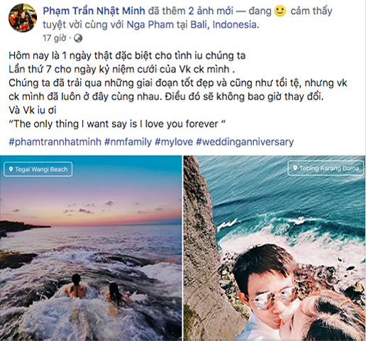 Dù đã lên chức bố vợ nhưng đại gia Minh Nhựa vẫn vô cùng lãng mạn không khác gì lúc mới yêu. Vừa qua, vợ chồng Minh Nhựa - Mina Phạm đã cùng nhau đi du lịch “hâm nóng” tình cảm ở Indonesia để mừng kỷ niệm 7 năm cưới nhau. Không những thế, Minh Nhựa còn gửi đến Mina Phạm câu nói đậm chất ngôn tình trong ngày đặc biệt này.