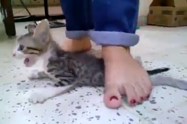 Cụ thể, trong đoạn clip dài gần 4 phút, một chú mèo con bị cột dây ở cổ kêu la thảm thiết khi ba cô gái thay phiên nhau dùng chân đạp lên. Không có sức phản kháng, chú mèo chỉ biết nằm im chịu trận và cuối cùng bị hành hạ đến chết.