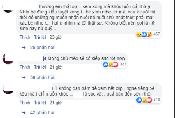 “Thương em thật sự. Xem xong mà khóc luôn mọi người ạ. Nhìn bé đúng kiểu tuyệt vọng. Ví dụ không nuôi thì hãy để những người khác nuôi chứ có nhất thiết phải mạt xác bé như thế không. Không biết nên gọi là nữ sinh hay ác quỷ nữa”, “Ước gì có luật bảo hộ động vật thì có lẽ những động vật này sẽ không phải chịu thiệt thòi nữa. Đáng lên án những con người kia”, một vài cư dân mạng bình luận.
