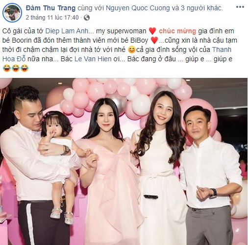 Ngoài ra, Đàm Thu Trang cũng từng có lời ám chỉ về chuyện con cái. Đăng loạt ảnh trong bữa tiệc sinh nhật con gái Diệp Lâm Anh, bà xã Cường Đô-la viết: “Chúc mừng gia đình em bé Boorin đã đón thêm thành viên mới bé BiBoy. Cũng xin là nhà cậu tạm thời đi chậm chậm lại đợi nhà tớ với nhé”.