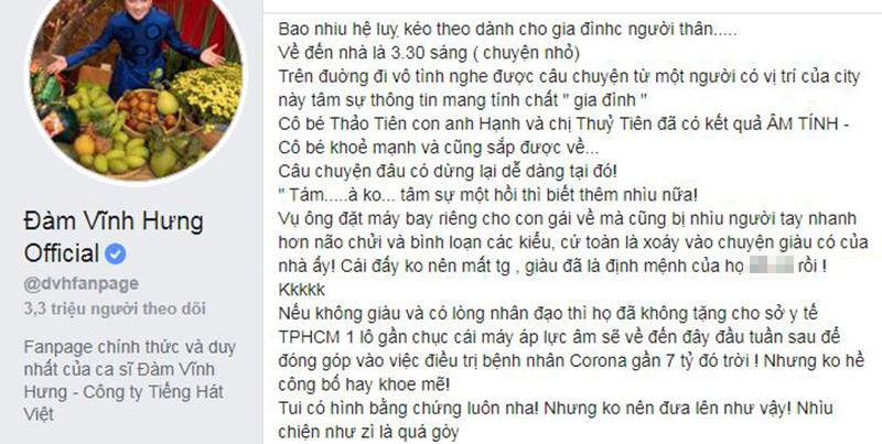 Nam ca sĩ viết: “Trên đường đi vô tình nghe được câu chuyện từ một người tâm sự thông tin mang tính chất “gia đình”. Thảo Tiên - con gái anh Hạnh và chị Thuỷ Tiên đã có kết quả âm tính. Tiên khoẻ mạnh và cũng sắp được về. Câu chuyện đâu có dừng lại dễ dàng tại đó. Tâm sự một hồi thì biết thêm nhiều nữa. Vụ ông đặt máy bay riêng cho con gái về mà cũng bị nhiều người bình luận các kiểu.