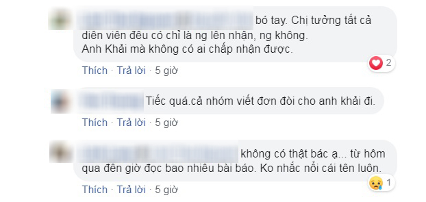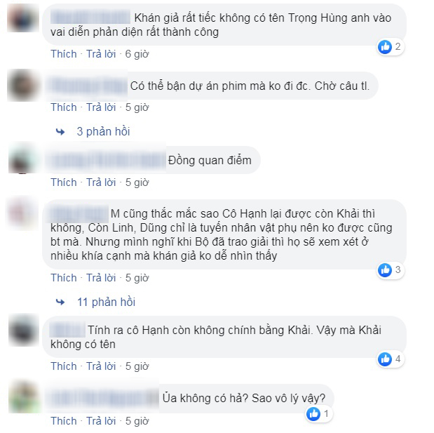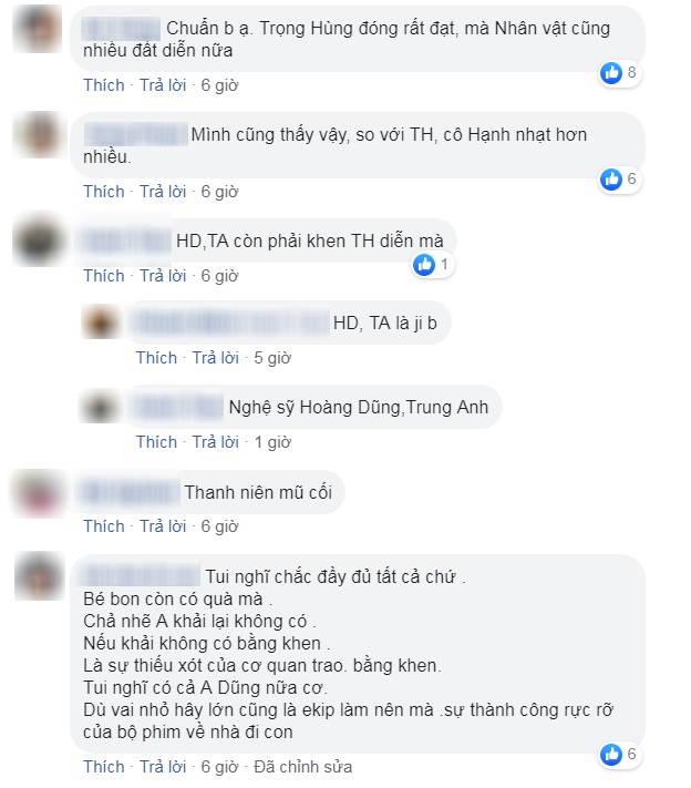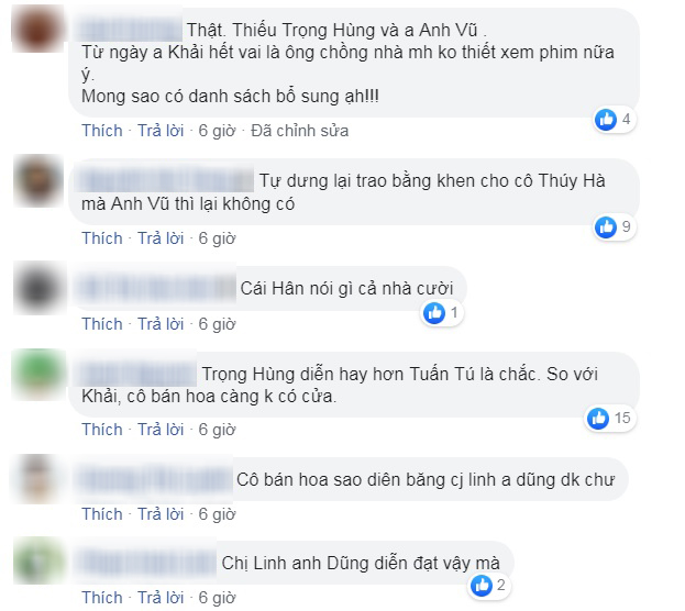 Chưa dừng lại ở đó, một số fan của diễn viên Trọng Hùng còn cảm thấy “uất ức” thay cho anh khi viết: “Có lẽ vai Khải hết vai sớm quá nên bị quên, chứ Trọng Hùng đóng rất đạt”; “Uất ức chứ không phải tiếc nữa. Vai diễn xuất sắc như vậy, diễn viên đầu tư nghiêm túc, vậy mà bị bỏ quên. Chắc kiểu mấy người lên danh sách coi sơ sơ mấy tập cuối xong lên danh sách nộp”; “Hay tại anh là nhân vật phản diện của phim nên không được trao bằng khen?”; “Nhân vật phản diện hay nhất cả bộ phim mà bị bỏ sót. Lỗi quá”…