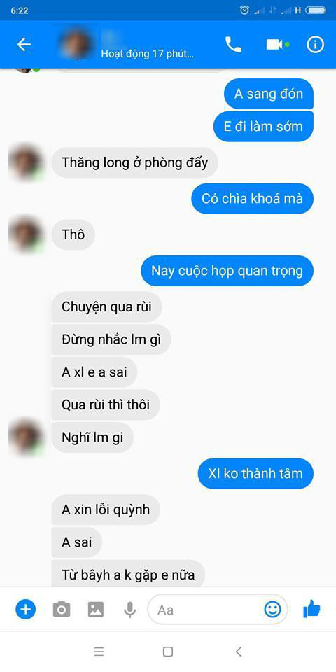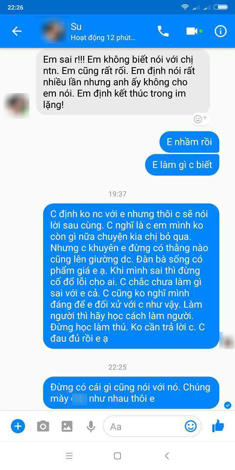 Điều đáng nói trong bài viết còn có đoạn hội thoại của cô gái với người bạn “sống lỗi” cùng người yêu. Người bạn kia liên tục gửi lời xin lỗi cô bạn sau khi mọi chuyện bị phơi bày. Còn anh người yêu mong muốn cô bạn cho qua chuyện này.