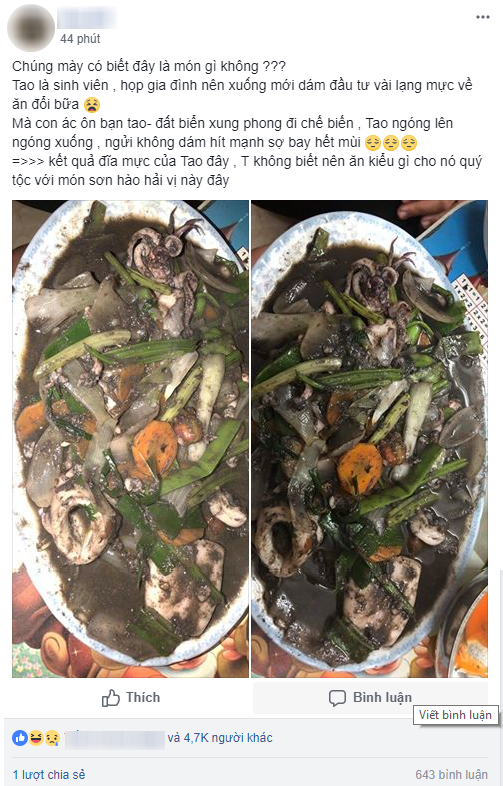 Đi kèm với bức ảnh minh họa, cô bạn cùng phòng ca thán: “Mình là sinh viên, họp gia đình nên mới mới dám đầu tư vài lạng mực về ăn đổi bữa. Bạn mình - dân đất biển xung phong đi chế biến. Mình ngóng lên ngóng xuống, ngửi không dám hít mạnh sợ bay hết mùi. Kết quả đĩa mực của mình đây! Không biết nên ăn kiểu gì cho “quý tộc” với món sơn hào hải vị này”.