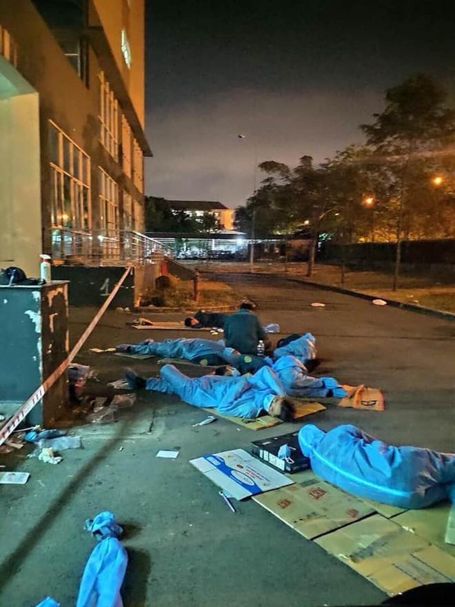 Tình nguyện viên, nhân viên y tế ngả lưng ngay tại bậc thang sau nhiều giờ làm việc mệt mỏi.