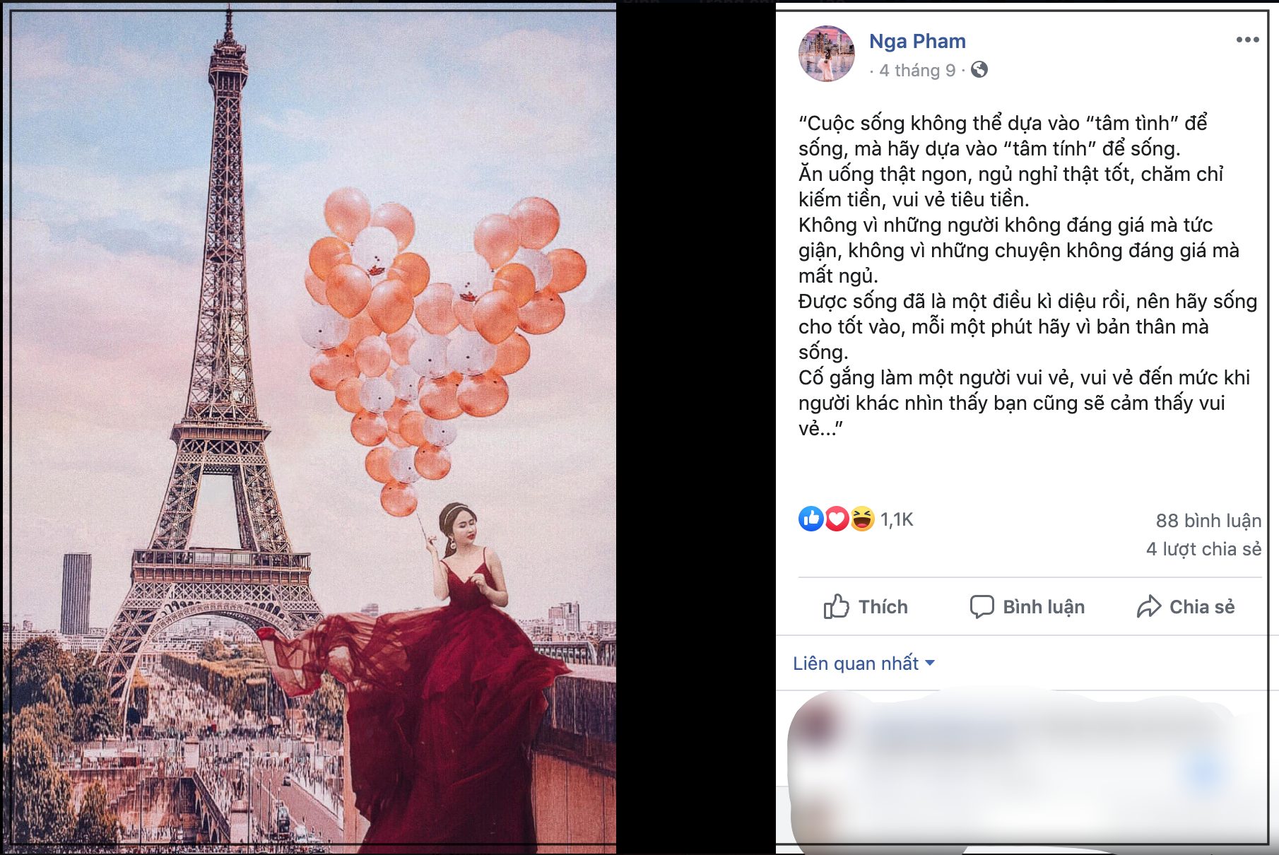 “Cuộc sống không thể dựa vào “tâm tình” để sống, mà hãy dựa vào “tâm tính” để sống. Ăn uống thật ngon, ngủ nghỉ thật tốt, chăm chỉ kiếm tiền, vui vẻ tiêu tiền. Không vì những người không đáng giá mà tức giận, không vì những chuyện không đáng giá mà mất ngủ. Được sống đã là một điều kì diệu rồi, nên hãy sống cho tốt vào, mỗi một phút hãy vì bản thân mà sống. Cố gắng làm một người vui vẻ, vui vẻ đến mức khi người khác nhìn thấy bạn cũng sẽ cảm thấy vui vẻ…”