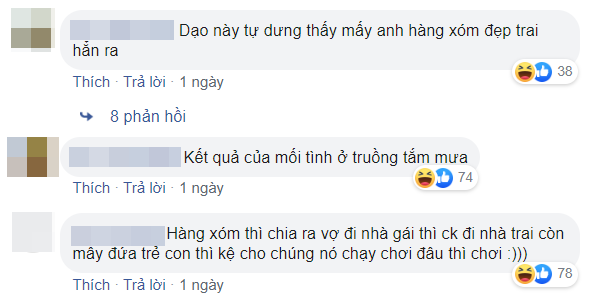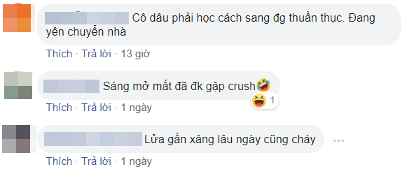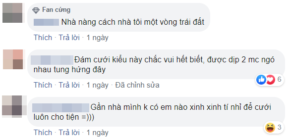 Nhiều người cũng tương tác góp vui khi tưởng tượng về cuộc sống hôn nhân sau này của các cặp đôi: “Lúc cãi nhau cô dâu said: em về mách bố”, “Vậy là cô dâu không được ngồi xe hoa mà phải đi bộ sang nhà trai rồi”, “Xa thế này thì chắc ngày về nhà đẻ chục lần”, “Chỉ cần mất cọng tóc của vợ thôi là nó bật rào về nhà bố mẹ nó rồi”,…