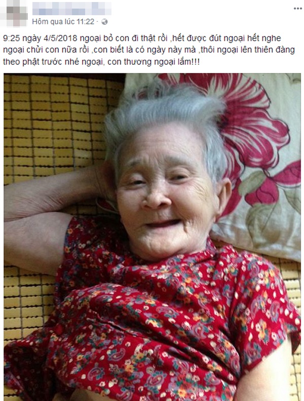 Con muốn ngoại chửi con tiếp. Con muốn quay thật nhiều clip của ngoại. Con muốn được khoe ngoại cho tất cả mọi người biết là con có một bà ngoại xinh đẹp… Con đau lòng lắm, chưa bao giờ con thấy xót xa như bây giờ. Tối nào con cũng đứng cạnh giường ngoại nhìn ngoại ngủ, đắp mền sợ ngoại lạnh rồi con mới vào phòng.