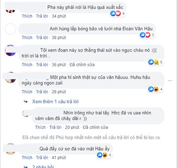 Rất nhiều người hâm mộ đã dành lời khen cho hành động cứu nguy vô cùng hiệu quả của Văn Hậu. “Giỏi quá Văn Hậu ơi”, “Nhìn Văn Hậu lúc đó thương quá, giỏi lắm luôn”, “Tuyệt vời quá Hậu ơi, Việt Nam cố lên”, “Anh hùng lấp bóng lưới nhà gọi tên Đoàn Văn Hậu,”…