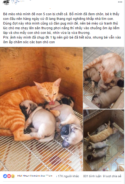 May mắn thay, nhà cũng có đàn pug mới đẻ, nên mèo mẹ cứ tranh thủ lúc chó mẹ chạy lên sân thượng phơi nắng thì nhanh chóng nhảy vào chuồng ôm ấp, liếm láp và cho mấy con chó con bú. Tuy đến nay mèo mẹ đã hết sữa nhưng chú mèo này vẫn vào ôm ấp và chăm sóc những chú chó con như những đứa con thơ của mình.