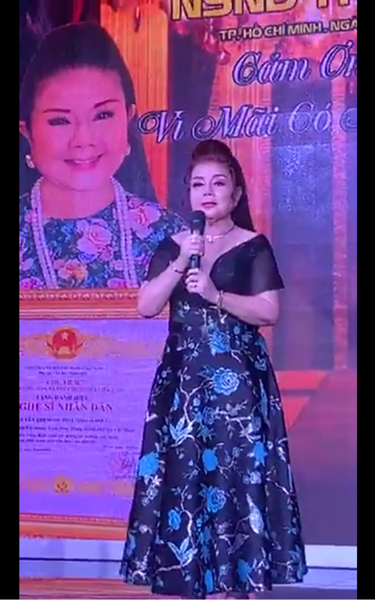 “Chúc mừng em vừa nhận được danh hiệu NSND. Em còn quá trẻ nhưng xin em đừng bước thêm bước nữa (cười). Hôm nay chị rất vui khi hội ngộ các anh em nghệ sĩ, đồng nghiệp. Chúng ta còn gặp nhau là vui, là hạnh phúc rồi. Mong mọi người lúc nào cũng yêu thương nhau. Thương em nhiều!”, NSND Ngọc Giàu nói.