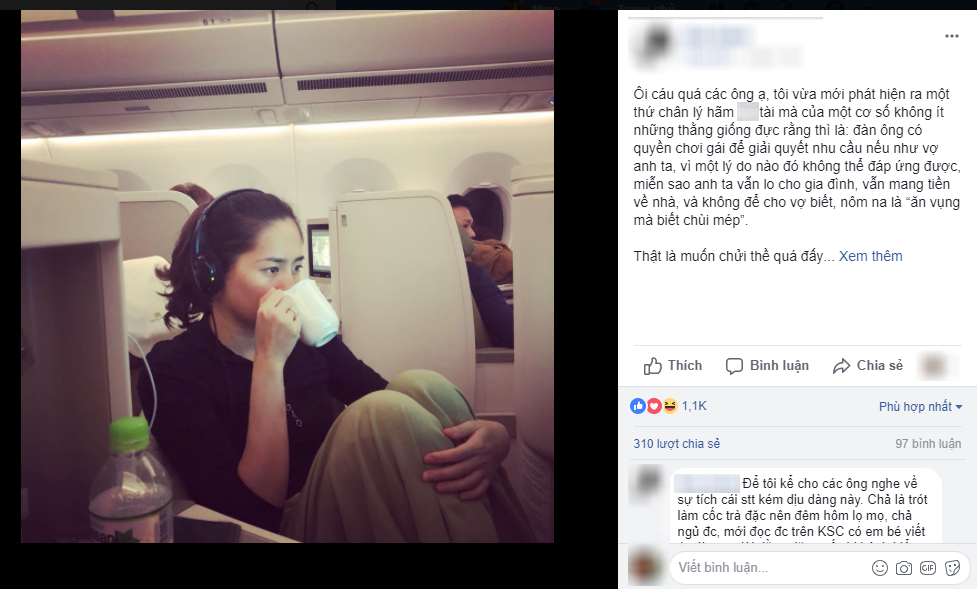 “Tôi rùng mình vì giữa xã hội hiện đại, người ta vẫn mang tư tưởng từ thời ăn lông ở lỗ. Rùng mình khi cả nửa xã hội xem việc phụ nữ hi sinh là bình thường còn việc đàn ông ăn vụng chùi mép là cao siêu. Thế nên, phụ nữ Việt Nam có thói xấu nhất là hi sinh, nó làm tổn thương chính họ và làm chồng họ hư”, chủ nhân bài viết chia sẻ.