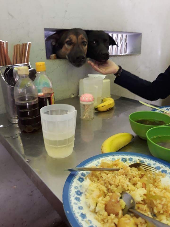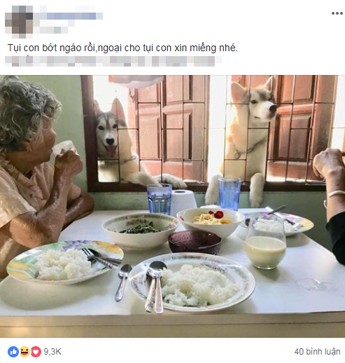 Tài khoản H.P hài hước viết: “Tụi con bớt ngáo rồi, ngoại cho tụi con xin miếng nhé!”. Kèm với đó là hình ảnh 2 con chó Husky đang hóng 2 cụ bà ăn qua khung cửa sổ.
