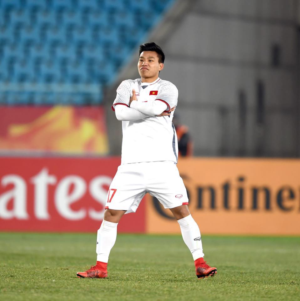 Vũ Văn Thanh với dáng đứng lừng lững ăn mừng tuyển Việt Nam chiến thắng tại bán kết U23 tháng 1 năm 2018