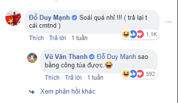 Đặc biệt hơn là phản ứng của Duy Mạnh, anh chàng dành lời khen cho Văn Thanh, tuy nhiên mục đích chính là đòi “cmtnd”. Sau đó, Văn Thanh cũng đáp trả vô cùng khéo léo: “Sao bằng công túa được” cùng icon mặt cười ra nước mắt và nhận được hàng trăm lượt bày tỏ cảm xúc.