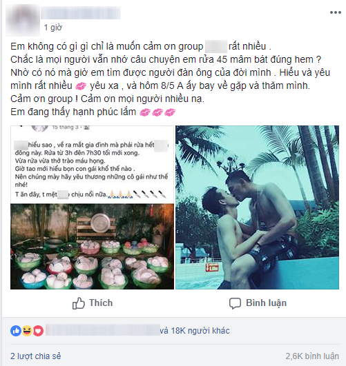 Liên hệ với Hoàng Nhật Anh (SN 1992, Hà Nội, stylist) chủ nhân câu chuyện, anh bạn chia sẻ sau bài viết rửa 45 mâm bát trên, Nguyễn Hoàng (SN 1992, Hà Nội, quản lý khách sạn) đã gửi lời mời kết bạn nhưng phải 1 thời gian sau mới bình luận trêu đùa. “Mình có hỏi thì anh ấy nói không dám bình luận vì em chảnh quá nên mình chủ động nhắn tin. Lần đầu, hai đứa nói chuyện đến 4h sáng. Sau 1 ngày, mình nhận lời yêu anh ấy”, Hoàng Anh tâm sự.