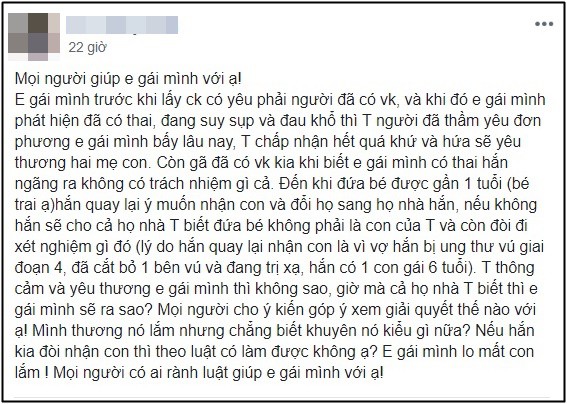 T thông cảm và yêu thương em gái mình thì không sao, giờ mà cả họ nhà T biết thì em gái mình sẽ ra sao? Mọi người cho ý kiến góp ý xem giải quyết thế nào với ạ! Mình thương nó lắm nhưng chẳng biết khuyên nó kiểu gì nữa? Nếu hắn kia đòi nhận con thì theo luật có làm được không ạ? Em gái mình lo mất con lắm! Mọi người có ai rành luật giúp em gái mình với!”.