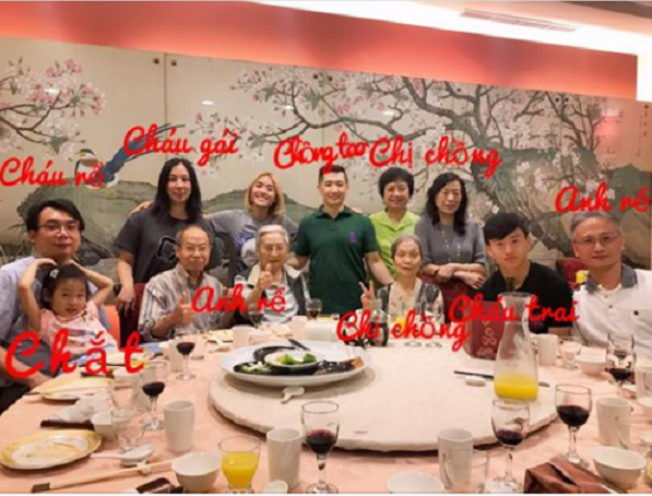 Minh Tâm chia sẻ rất thú vị về bức ảnh tóm tắt gia phả nhà mình: “Trong ảnh này là anh chị, các cháu và chắt của nhà chồng. Tóm tắt thì dàn anh chị từ 71 tới 92 tuổi. Cháu thì từ tầm 43 tới 50 tuổi. Chắt thì như mọi người thấy là 5 tuổi. Không biết mọi người sao chứ lúc đầu ngại miệng khi xưng hô lắm vì mình U30. Đặc biệt là chị 81 và anh 91 tuổi biết nói tiếng Việt nên xưng hô anh - chị với mình rất rõ ràng”.