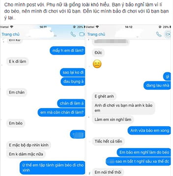 Mới đây, đoạn tin nhắn với nội dung khá hài hước xoay quanh câu chuyện cô bạn gái muốn được đi chơi cùng người yêu nhưng không nói rõ khiến anh chàng không hiểu ý. Bức xúc, nickname D.Đ chia sẻ với cộng đồng mạng kèm theo câu nói: “Phụ nữ là giống loài khó hiểu. Bạn ý bảo nghỉ làm vì lí do béo, nên mình đi chơi với lũ bạn. Đến lúc mình bảo đi chơi với lũ bạn bạn ý lại..”.