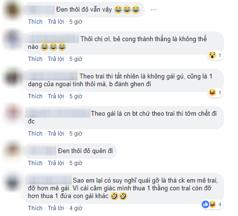 Và ngoài những bình luận như trên, cũng có không ít chị em hài hước hơn khi nói: “Thôi kệ thà theo trai hơn theo gái”, hoặc “sao em lại có suy nghĩ quái gở là thà chồng em mê trai, đỡ hơn mê gái. Vì cái cảm giác mình thua 1 thằng con trai còn đỡ hơn thua 1 đứa con gái khác”.