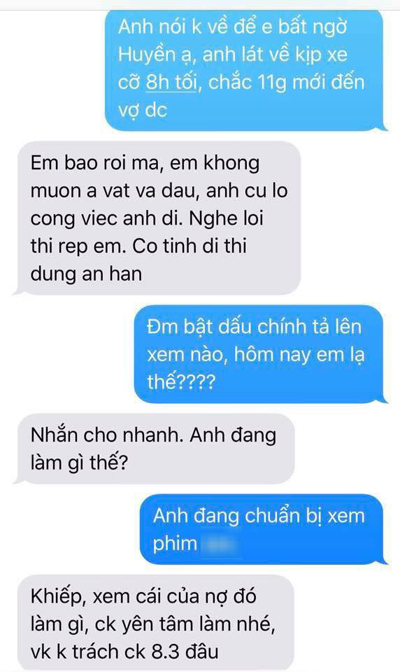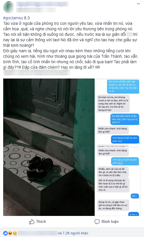 Đôi giày nam lạ, tiếng dịu ngọt với nhau kèm theo những tiếng cười khi xem hài, hình như thoáng qua cho giọng hài của Trấn Thành. Mình vẫn bình tĩnh và nhắn tin nhưng nó chối bảo đi qua nhà bạn. Mình phải làm gì đây? Đập cửa đâm chém hay im lặng đi về?”.