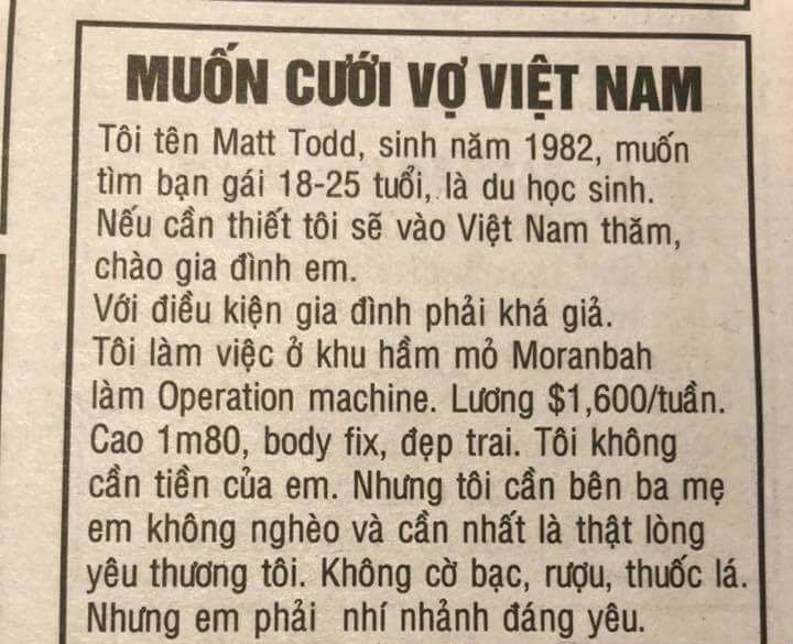 Mẩu tin gây xôn xao “muốn cưới vợ Việt Nam”.