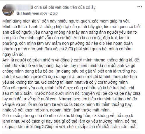 Trước hôm cưới mình nói chuyện với bé đó và bé này chia tay anh để tự về quê nuôi con. Nhưng theo tìm hiểu chồng mình lại theo bé đó về quê và xin lỗi muốn làm lại với cô ta. Gia đình mình thì thỉnh thoảng hay nhắc về cô ta, khen cô ta xinh, ngoan, hiền lành trước mặt mình. Giờ mình sống trong nhà đó như cái xác không hồn, chồng không về, bố mẹ chồng lạnh nhạt. Ai có cách gì hay bùa gì có thể làm chồng yêu thương mình, bố mẹ chồng quan tâm mình không? Giúp mình với, chứ mình sắp sinh rồi chắc trầm cảm mất!”.