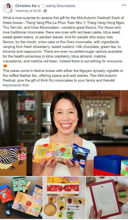 Hơn 20 năm kinh nghiệm trong ngành bánh Trung thu tại Việt Nam, Kinh Đô là nhãn hàng vô cùng quen thuộc, được tín nhiệm với cả người mua bánh để thưởng thức và người mua bánh để biếu tặng mỗi dịp tết đoàn viên. Đã chạm, đã nhìn, đã hít hà, đã nếm thử, và đã bị chinh phục, các đầu bếp nổi tiếng của Việt Nam đã phải nhất định chọn bánh Trung thu Kinh Đô để làm quà tặng cho người thân và đối tác của mình. Christine Hà khẳng định: “Không ngoài mong đợi, Kinh Đô luôn mang đến những tuyệt tác trọn vẹn đến với mọi người.”