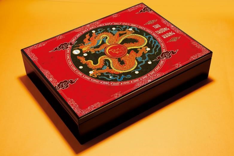 Vượt trên cả yếu tố “mỹ” quan, bánh Trung thu Trăng Vàng Kim Cương được gửi đến chef Hải còn được đựng trong hộp sơn mài thủ công với hình tượng rồng ổ, mây lành trên gốm Lam thời Lê. Rồng là hình tượng đặc biệt trong nghệ thuật truyền thống Việt bởi linh vật này là một trong những biểu tượng văn hóa quan trọng nhất gắn liền với nguồn gốc ra đời của dân tộc.