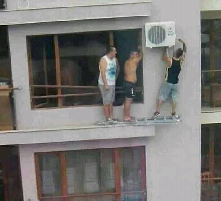 2 người đứng ở trong thực hiện “nhiệm vụ” giữ thăng bằng cho chiếc thang, giúp người đàn ông ở ngoài có thể đưa 2 tay lên cao sửa máy lạnh. 2 chân người này đứng trên các thanh ngang khá nhỏ của chiếc thang và trên người cũng không có bất kì dụng cụ bảo hộ nào.