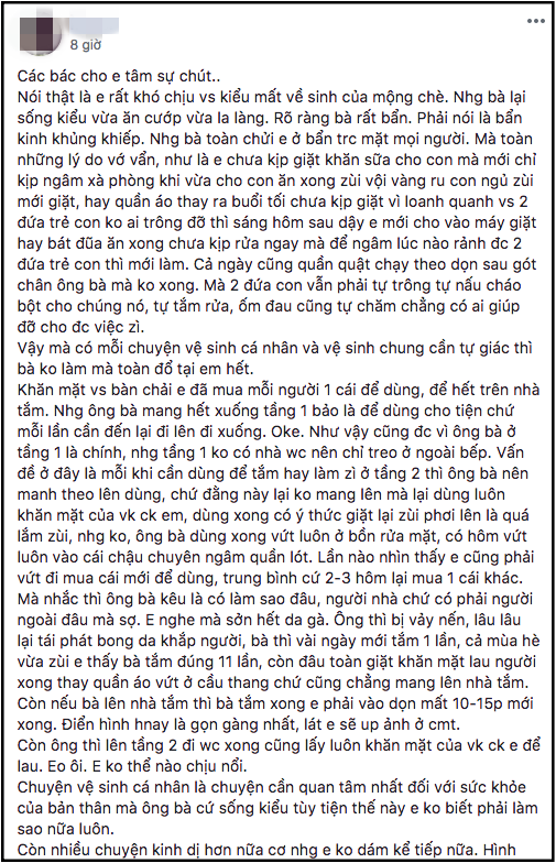 Mới đây, trên MXH xuất hiện một bài viết khá dài của nàng dâu trẻ xoay quanh vấn đề này. Được biết khi mọi chuyện vượt quá sức chịu đựng, nàng dâu tên I.C mới phải đăng chuyện của mình lên MXH để xin hội chị em cao kiến: