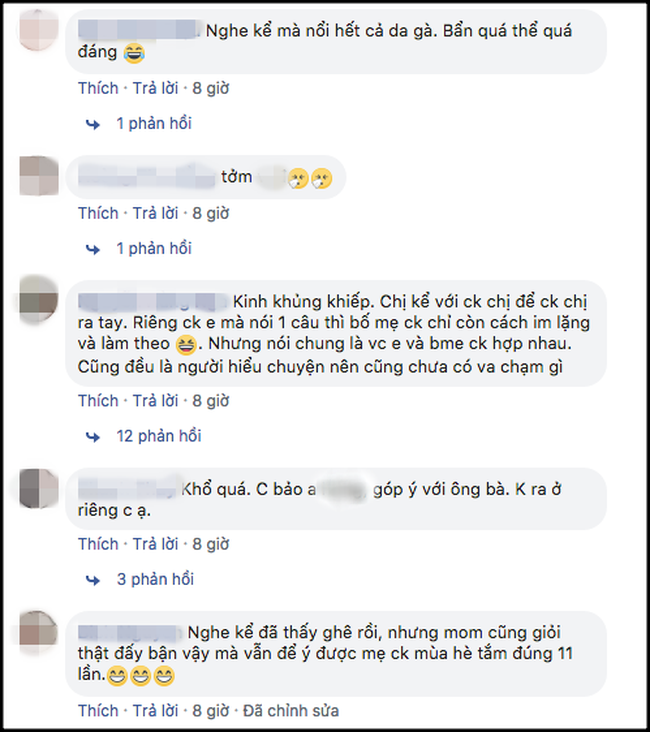 Để lại bình luận bên dưới bài đăng này, hội chị em đã hết lời khuyên nàng dâu nên trao đổi lại với chồng để được ra ở riêng. Hoặc bước đường cũng không thể ở riêng, cũng hãy để chồng ra mặt góp ý với bố mẹ.