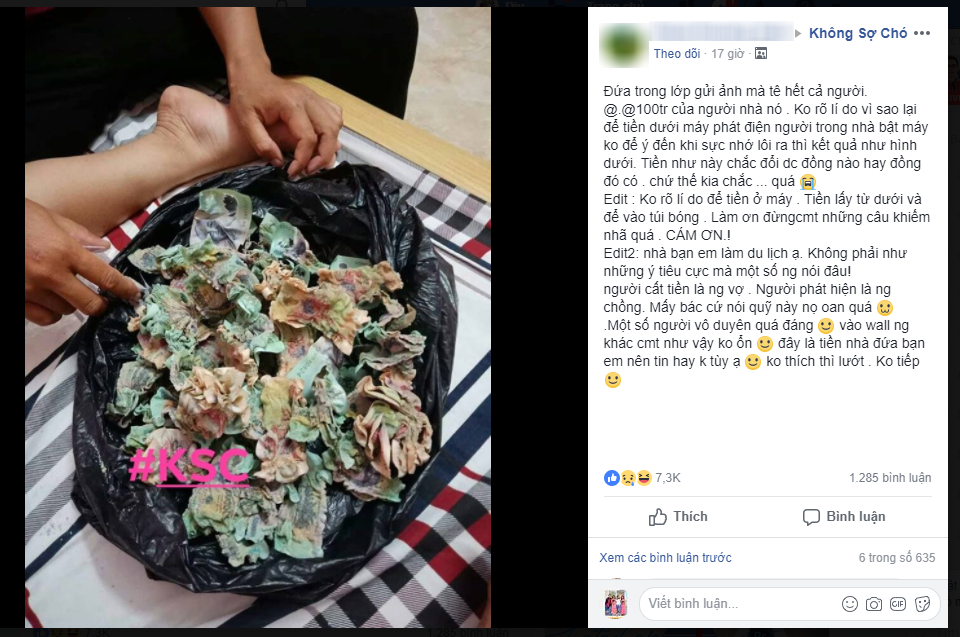 Bức ảnh trên được tài khoản P.Thảo đăng tải trên mạng xã hội đã nhanh chóng khiến nhiều người tò mò. P.Thảo chia sẻ “Đứa trong lớp gửi ảnh mà mình tê hết cả người. 100 triệu của người nhà nó. Không rõ lí do vì sao lại để tiền dưới máy phát điện. Người trong nhà bật máy không để ý đến khi sực nhớ lôi ra thì kết quả như hình dưới. Tiền như này chắc đổi được đồng nào hay đồng đó…”