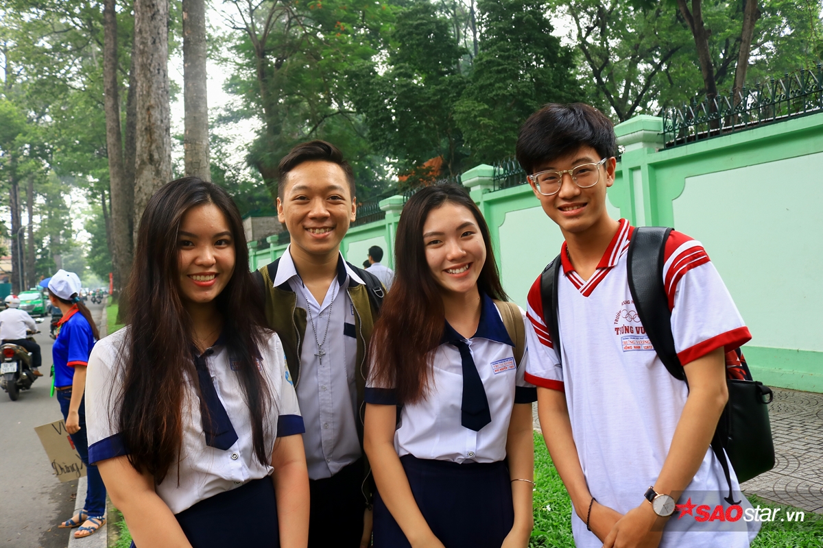 Nhóm các bạn Bảo Anh, Song Vũ, Minh Nguyệt, Hồng Nam (THPT Tưng Vương) vui vẻ khi làm được bài thi môn Ngữ Văn.