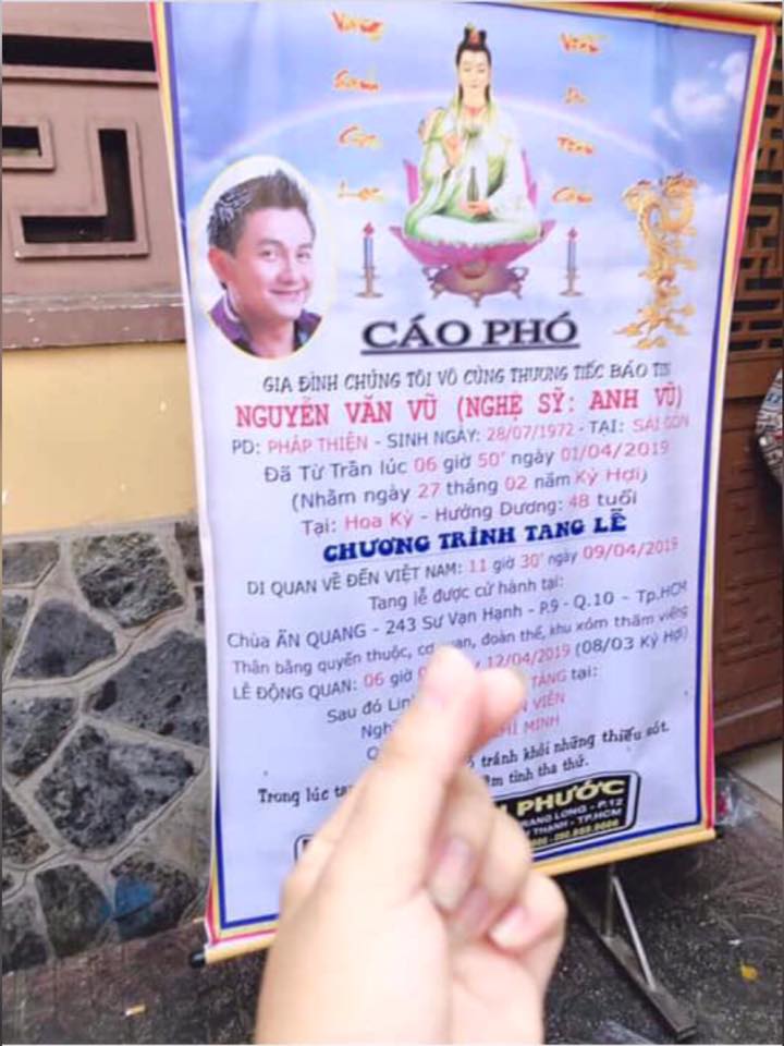 Ngày 9/4, lễ tang của nghệ sĩ Anh Vũ được tổ chức tại chùa Ấn Quang sau khi thi hài anh được đưa từ Mỹ trở về. Đã có rất đông đồng nghiệp, bạn bè và người hâm mộ đến tiễn đưa anh. Trước sự ra đi đột ngột của người nghệ sĩ xấu số, ai cũng cố gắng kiềm chế sự xúc động, không bật khóc, để người đã khuất có thể thanh thản về nơi vĩnh hằng.
