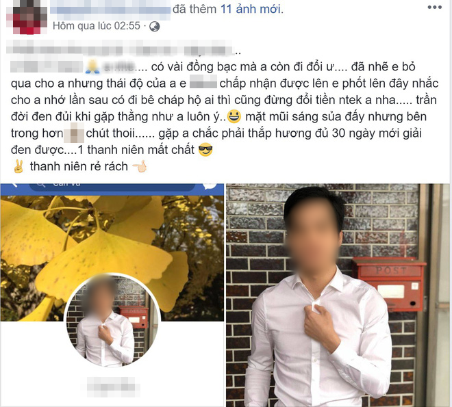 Trên mạng xã hội, cô bạn này viết: “Có vài đồng bạc mà anh còn đi đổi ư? Đáng lẽ em bỏ qua cho anh nhưng thái độ của anh làm em không chấp nhận được nên ”phốt” để nhắc cho anh nhớ, lần sau có đi bê tráp hộ ai thì cũng đừng đổi tiền như thế anh nha. Trần đời đen đủi khi gặp thằng đàn ông như anh, mặt mũi sáng đấy nhưng bên trong mất chất quá”.