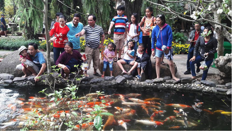 Thiên nhiên sinh động và gần gũi với hồ cá Koi đông vui, rộn ràng. Bạn sẽ vô cùng thích thú khi thử cho cá đớp mồi đấy!