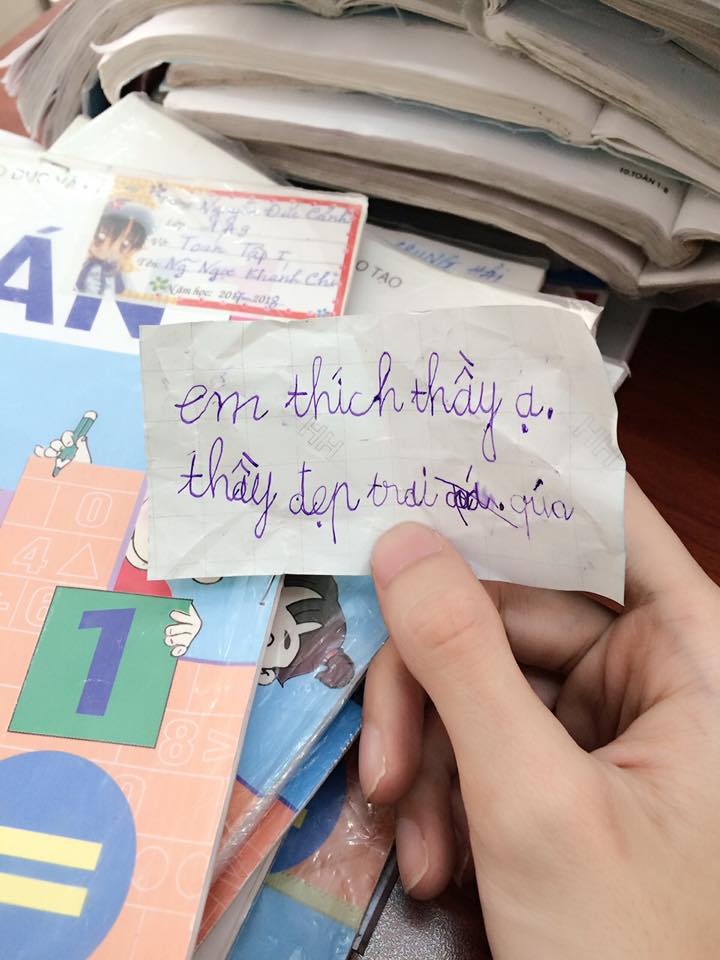 Đăng tải câu chuyện trong một group kín nổi tiếng, bài viết của thầy giáo trẻ có tên Hoàng Bin đã nhận về hàng nghìn lượt thích. Đó là câu chuyện về mẩu giấy nhớ có ghi ”Em thích thầy ạ. Thầy đẹp trai quá'' của một cậu học sinh dành cho Hoàng Bin.
