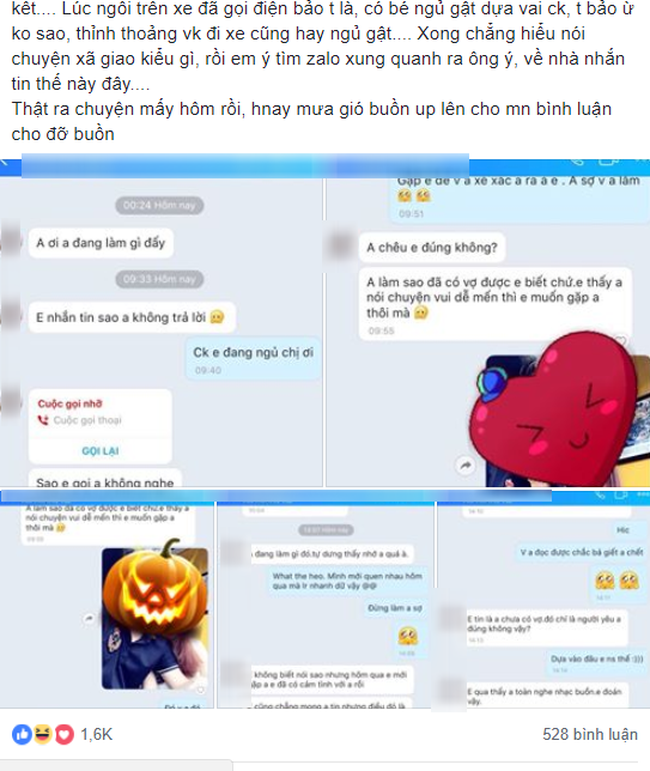 Điển hình như câu chuyện của cô vợ trẻ trong tâm sự dưới đây. Chẳng là chồng cô ấy trên xe khách đã có lòng tốt cho 1 cô gái khác say xe dựa vào vai để ngủ.