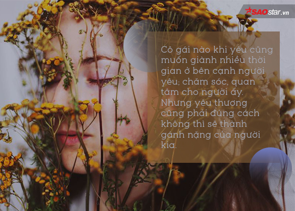 Cô gái nào khi yêu cũng muốn giành nhiều thời gian ở bên cạnh người yêu; chăm sóc, quan tâm cho người ấy. Đó là dấu hiệu của một tình yêu chân thành, không có gì đáng chê trách cả. Nhưng yêu thương cũng phải đúng cách, nếu không tình yêu đó sẽ trở thành gánh nặng cho người kia.