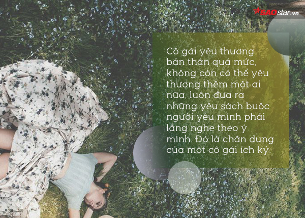 Nhưng kiểu con gái yêu thương bản thân quá mức, không còn có thể yêu thương ai khác kể cả người yêu của cô ấy, thậm chí chỉ chăm chăm đòi hỏi người yêu cũng phải yêu thương, nuông chiều cô như cách mà cô ấy “thiết đãi” bản thân, quả thật không phải là một mẫu bạn gái lý tưởng. Đó không hề là một cô gái hiện đại độc lập, tự tin, mà trước mắt người yêu họ chỉ là một cô bạn gái ích kỷ.