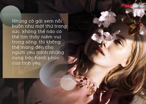 Ai cũng gặp những khó khăn, cũng phải trải qua những khoảng thời gian tồi tệ, và đó chính là lúc mà những cô gái cần được người yêu ở bên cạnh nhất. Tình yêu chân thành là kiên nhẫn ở bên nhau, cùng nhau vượt qua những khó khăn, nối buồn của nhau. Nhưng họ ở đó, để cùng bạn vượt qua, chứ không phải cùng bạn chìm đắm trong những cảm xúc tiêu cực như. Thế nên, những cô gái xem nỗi buồn như một thứ trang sức - không thể tìm thấy mặt tích cực, vui vẻ trong cuộc sống, không thể đối mặt hay vượt qua những vấn đề của bản thân, sẽ làm cho tình yêu của hai người không có lấy một ngày được vui vẻ, khiến cho cảm xúc của đối phương bị ảnh hưởng theo.