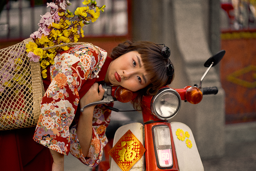 Trong lúc đó, trước bộ áo dài cách tân sành điệu và chiếc Honda Cub huyền thoại, Trang Hý gây thương nhớ khi gợi nhớ về không khí Tết phía Nam hồi thập niên 90 - 2000. Vào những ngày cận Tết thuở ấy, người Sài Gòn thường tìm đến “phố tài lộc” Hải Thượng Lãn Ông hay chợ Bình Tây để sắm vật dụng trang trí.